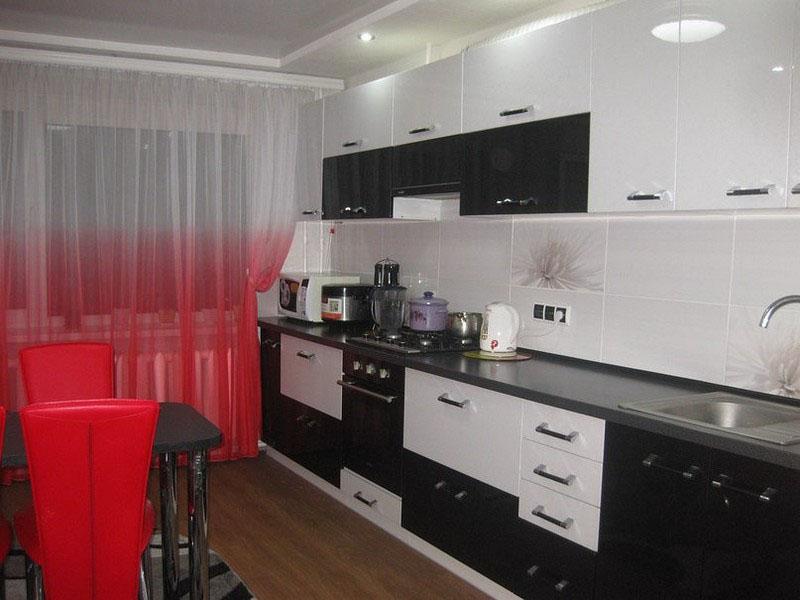 Важнейшее достоинство прямой кухни заключается в формирования максимально комфортных условий для приготовления и приема пищи, одновременно, сохраняя достаточно много свободного места.